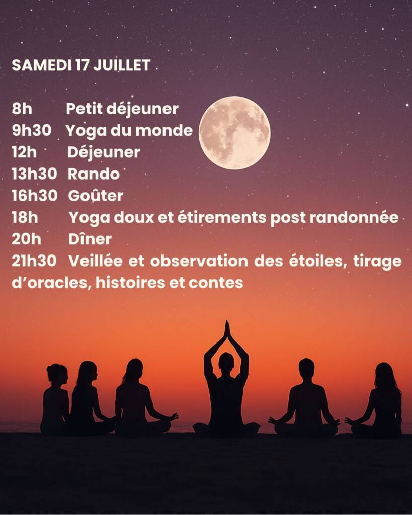 Yoga, randonnées, méditation, partages, coucher de soleil, observation des étoiles… un programme doux et profond pour nourrir le corps et l’âme.